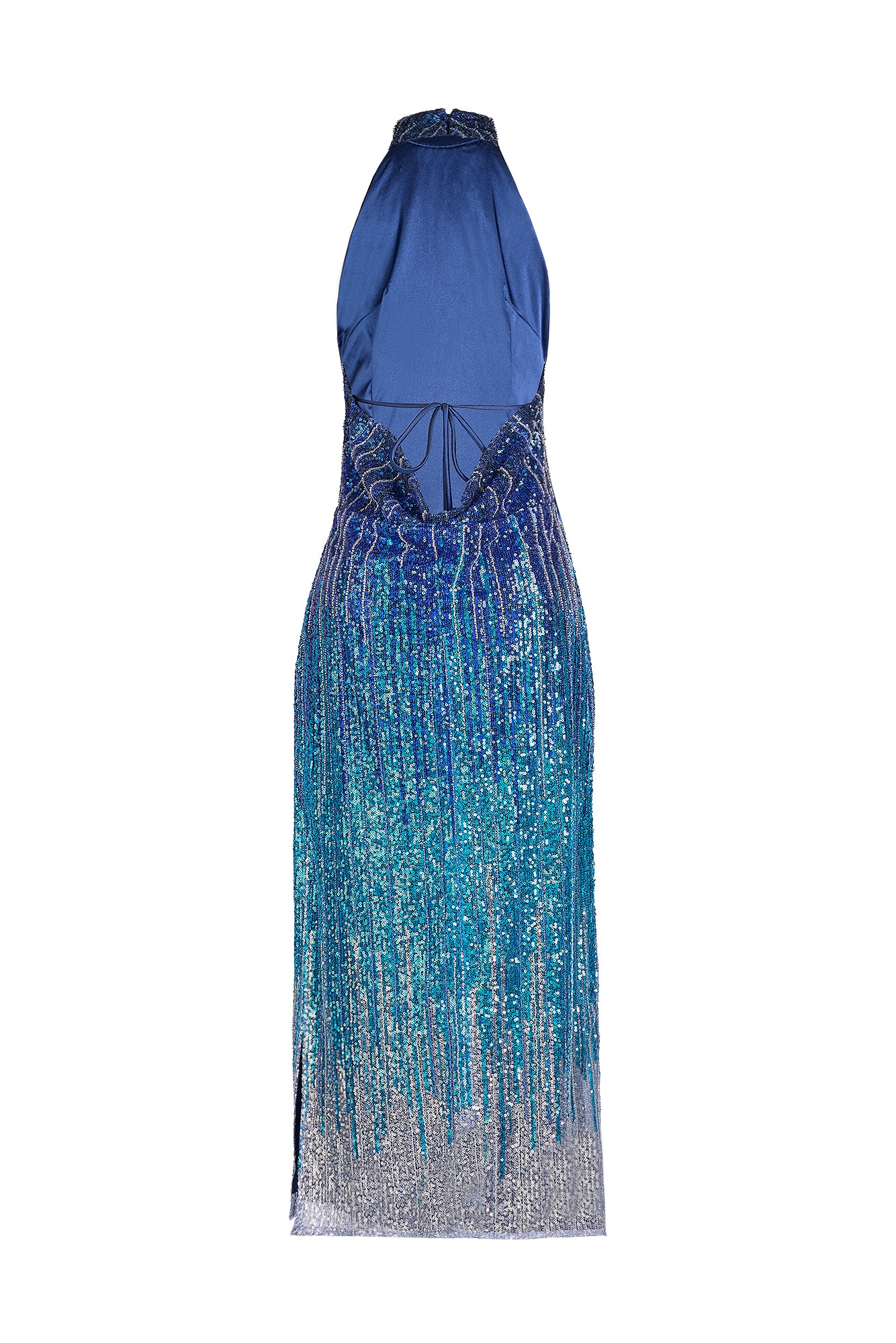 Gradient blue sequin halter gown with high neckline, open back, and gradient beading.