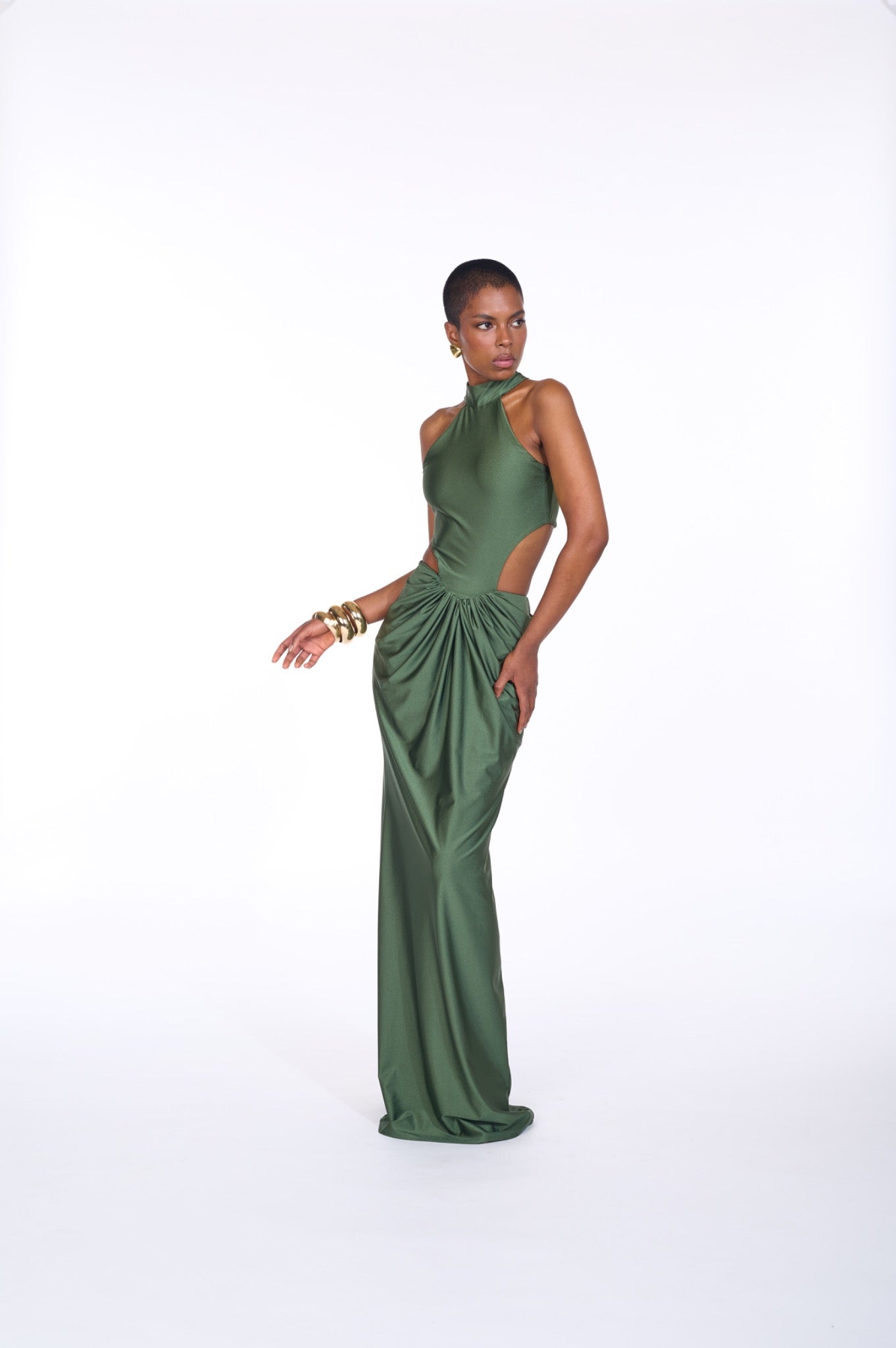 Green halter gown with waist cut-outs, gathered hip draping, and column skirt.