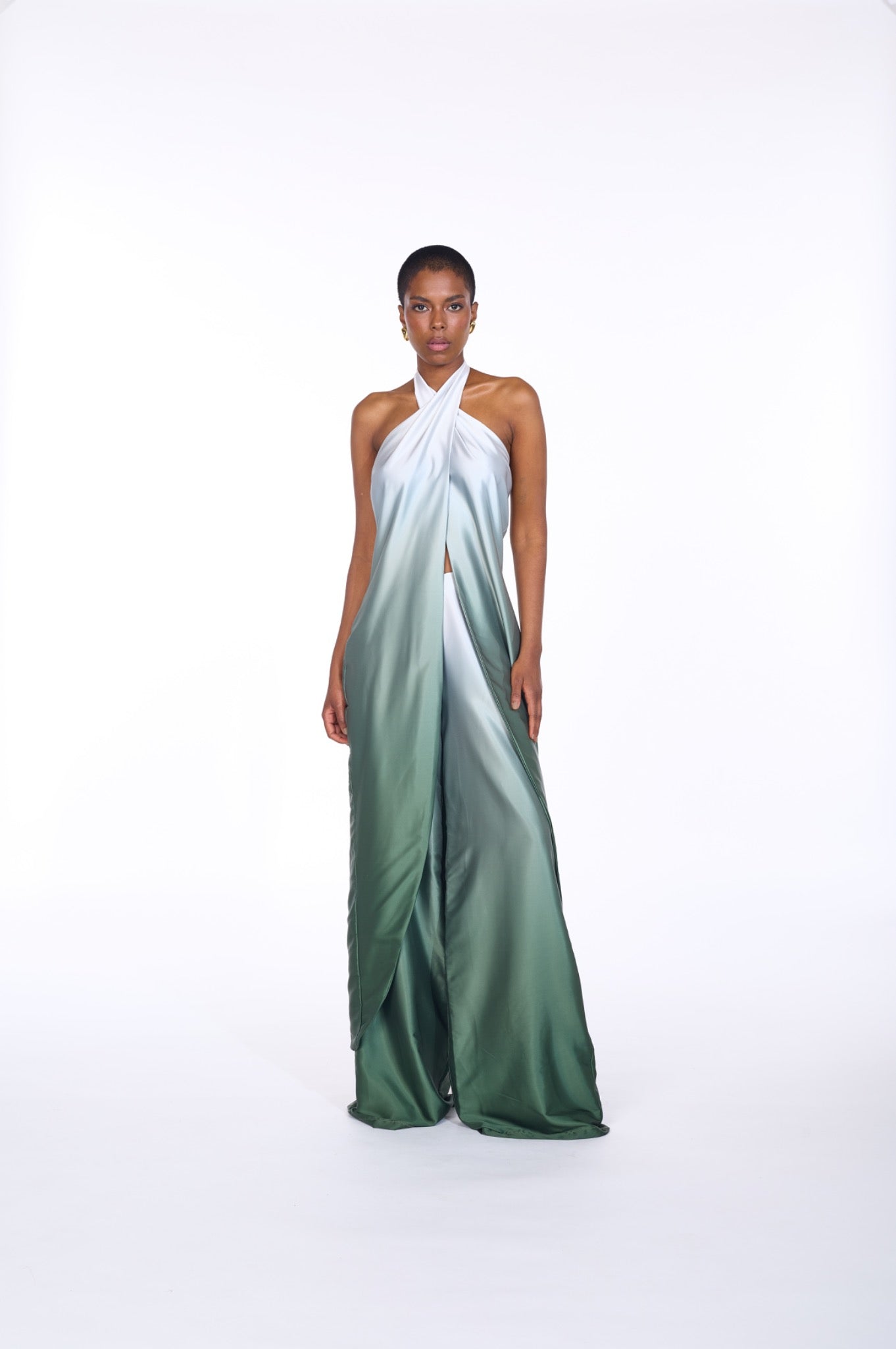 Green ombre satin halter top with crossover neckline and front slit detail.